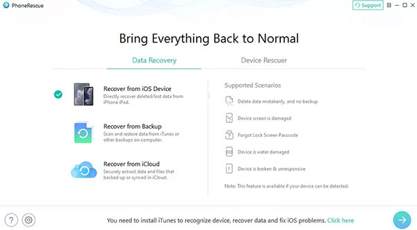 PhoneRescue is a well-known iPhone data recovery software that combines data recovery with basic iOS system-repair utilities. The repair feature is very helpful when data loss happens after a system crash or device malfunction. This software supports the recovery of lost data from the iPhone device itself, iCloud backups, and iTunes backups.